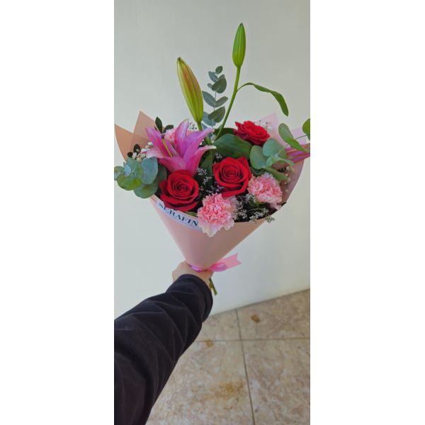 Delicada mezcla de lirios, 3 rosas y 2 claveles, ideal para un gesto romántico. El envoltorio puede variar.