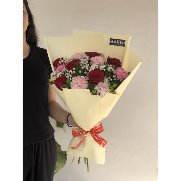 Versión grande del estilo coreano, con 6 rosas y 6 claveles en un diseño trabajado. El envoltorio puede variar.