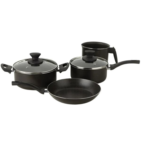- Set de Cocción 4 Piezas Gourmet Antiadherente de Aluminio. Contiene Sarten de 24 cm, Hervidor de 14cm, olla de 18 cm, Cacerola de 22cm.