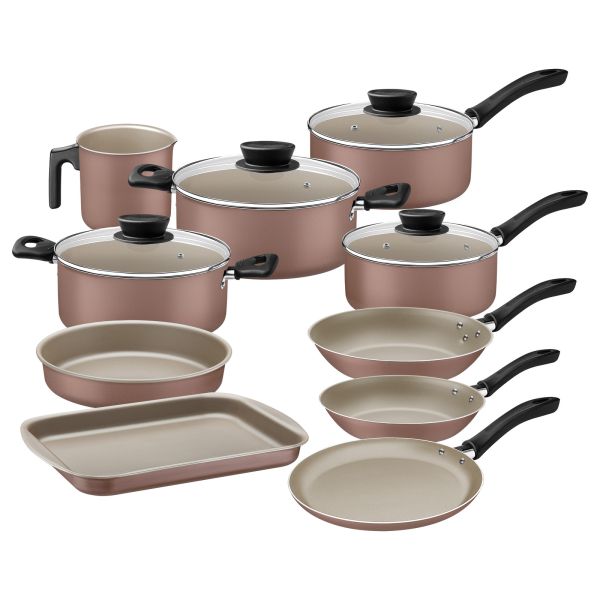 Descripción comercial La batería de cocina Tramontina Linz de aluminio de 10 piezas con revestimiento antiadherente Starflon Max mocaccino interior y exterior es la opción ideal para quienes buscan un juego completo y funcional. Disponible en diferentes formas y capacidades, satisface una amplia gama de necesidades en la cocina. Las piezas están hechas de aluminio con revestimiento antiadherente, que garantiza una cocción uniforme, evita que los alimentos se peguen y facilita la limpieza. Las asas y agarres resistentes al calor garantizan un manejo seguro, y las tapas de vidrio templado con bordes de acero inoxidable facilitan el control de la cocción. Un juego versátil que hace la vida cotidiana más cómoda.