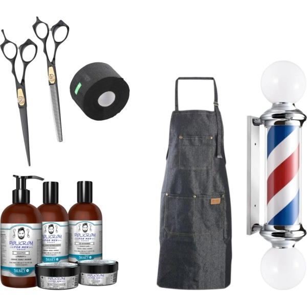 ¡COMBO EMPRENDEDOR! BARBER POLE + KIT DE TIJERAS + DELANTAL JEAN + KIT DE PAPEL DE CUELLO + KIT POLICROM