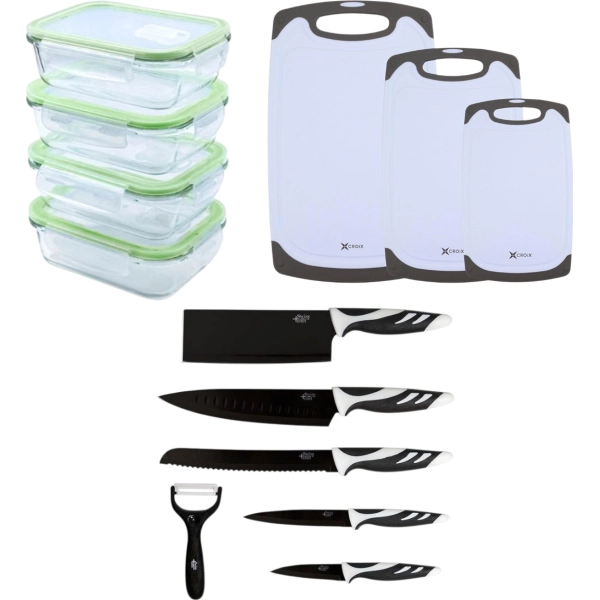 ¡COMBO MARKETPLACE! SET DE CUCHILLOS CECOTEC PROFESIONALES SUIZOS + SET TRES TABLAS BLANCO/NEGRO + SET DE 4 RECIPIENTES DE VIDRIO 640ML CROIX