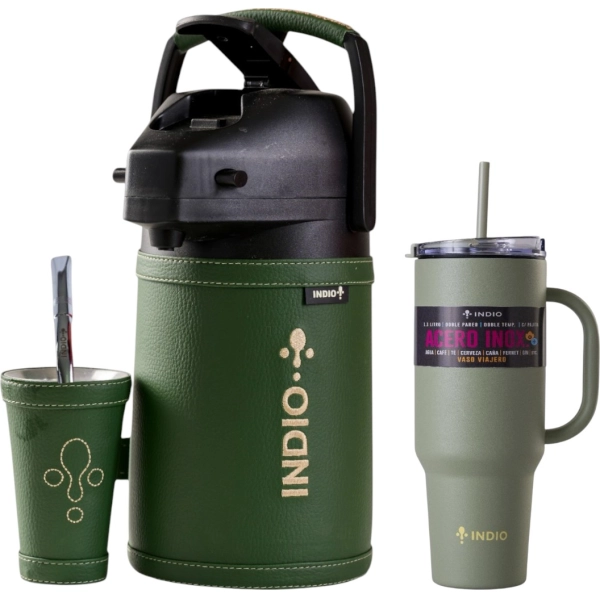 ¡COMBO MARKETPLACE! TERMO TERERE INDIO 1.9 LT SIMIL CUERO VERDE + VASO VIAJERO VERDE 1.1L