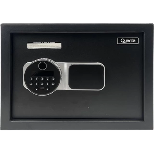 Caja Fuerte Digital Quanta 8.5L con construcción de acero, códigos de hasta 8 dígitos, y almacenamiento de hasta 29 huellas dactilares. Incluye dos llaves tubulares de anulación, conector tipo C para energía externa, y cuatro pilas AAA. Dimensiones: 200x310x200mm. Peso: 4,5 kg. Incluye 2 juegos de tornillos, 2 llaves y 4 pilas AAA.
