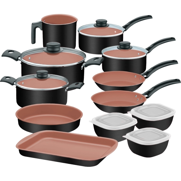 Garantice lo mejor para preparar sus comidas conlos juegos de ollas Tramontina en aluminio con revestimiento interno y externo antiadherente Starflon Max grafito. Ideales para el uso diario, sus piezas le ayudarán con mucha más practicidad, ya que cocinan los alimentos de manera uniforme y evitan que se peguen en la superficie, todo ello gracias a que están fabricadas en aluminio con revestimiento interno y externo de antiadherente Starflon Max. La olla y la cacerola del juego incluyen tapas de vidrio templado con bordes de acero inoxidable, que facilita y ayuda en la preparación de los alimentos. Los mangos, asas y agarradores son de material antitérmico, no se calientan y proporcionan más comodidad y seguridad durante el manejo. ¡Además de todas estas características, las piezas son más duraderas, no son perjudiciales a la salud y son muy fáciles de limpiar, además de ser aptas para lavavajillas, lo cual facilita sus tareas en la cocina!