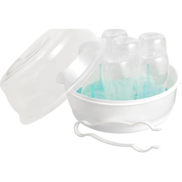 Es ideal para garantizar la higiene de los accesorios de tu bebé de manera rápida y segura. Funciona con vapor, esterilizando mamaderas, tetinas y chupetes en solo 2 a 6 minutos. Con capacidad para 4 mamaderas y 4 accesorios, es compacto y fácil de usar. Viene con una bandeja con alza central para facilitar la extracción y pinzas para evitar el contacto directo con agua caliente.Es perfecto para viajes y paseos y está libre de BPA.