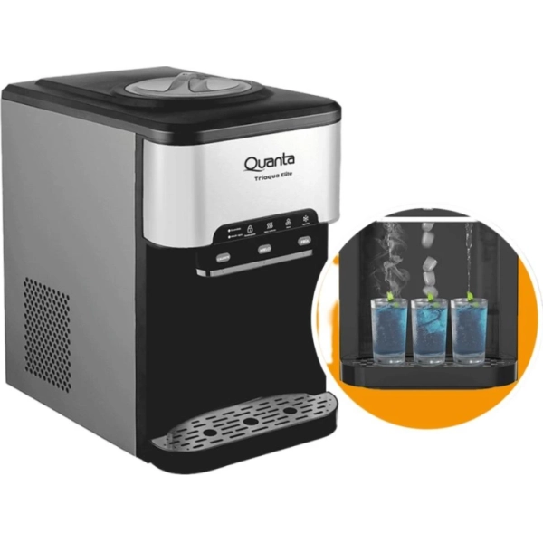 Disfruta de agua fría, caliente y hasta 20 kg de hielo al día con el Bebedero de Mesa 3x1 Triaqua Elite de Quanta. Un diseño elegante y práctico con bloqueo de seguridad para niños, autolimpieza y acabado en acero inoxidable, ideal para el hogar o la oficina.