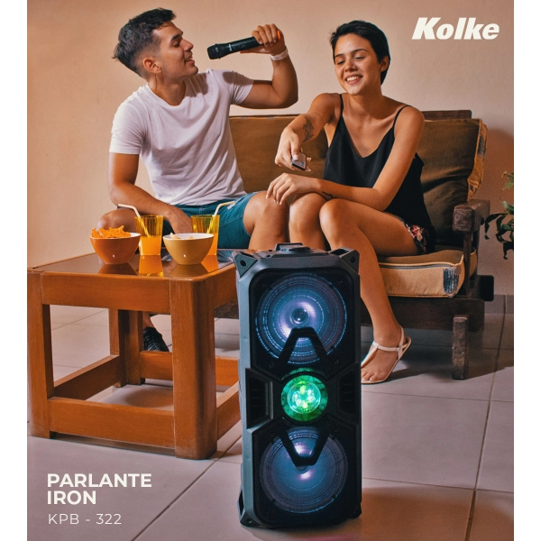 PARLANTE KOLKE DOBLE 6.5" IRON KPB-322 Función TWS. Incluye: Micrófono inalámbrico, cable de carga, cable de audio y control remoto.