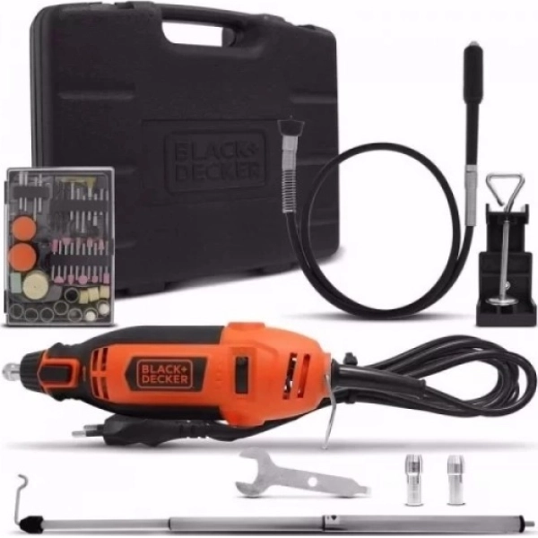 MINITORNO 120W B+D RT18 - CON 113 PIEZAS. Black+Decker RT18K. Minitorno 113pzs 120W. Características: Potencia 120W Empuñadura Ergonómica Velocidad Variable de 0 a 35,000 RPM Kit con caja plástica y 113 accesorios Eje Flexible para Mayor Versatilidad Sistema de collar universal: acepta todos los accesorios estándar de herramientas giratorias Corta, realiza grabados y afila Incluye: Minitorno,(1) prensa soporte,(1) eje metálico ajustable para colgar, (1) eje flexible, (1) llave para collet, (3) collets: 1/8”, 3/32”, 1/16”, (23) discos de corte, (31) discos de lijado, (1) tambor para lijado, (18) cintas para lijado, (9) discos de fieltro para pulir, (1) cepillo de bronce, (1) cepillo de bronce radial, (1) cepillo de cerdas, (1) cepillo de cerdas radial, (3) mechas diamantadas, (3) brocas multiuso, (2) mandriles de tornillo, (1) mandril para ruedas de fieltro, (1) piedra de rectificado, (10) piedras de amolar y caja plástica.
