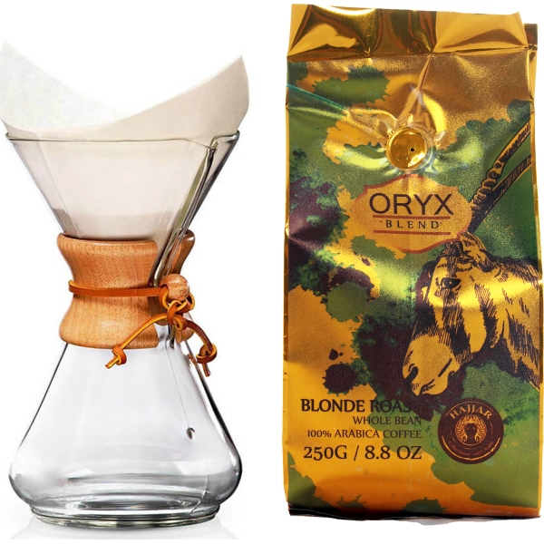 Cafetera Chemex de Vidrio con filtro de acero inoxidable de 400 Ml con agarre de goma. Café “ORYX” de HAJJAR®️, inspirado en este mamífero de la familia del bóvido que forma parte de la fauna en la península arábiga. De tueste claro, con sabores delicados, dando como resultado un café con aromas florales y afrutadas con una excelente acidez y además un cuerpo más liviano. Es en los tuestes claros donde se pueden saborear las características naturales del café.