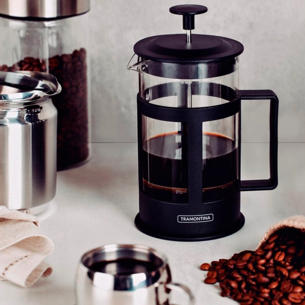 Con la cafetera francesa Tramontina en vidrio y polipropileno negro de 1 litro se asegurará los mejores cafés para su rutina diaria. Le brindará 100 % aroma y sabor para su café, que se prepara de una forma muy práctica y fácil. ¡Con un tamaño compacto, permite llevarla adonde se la necesite para disfrutar un café rico y diferente donde sea que se encuentre!