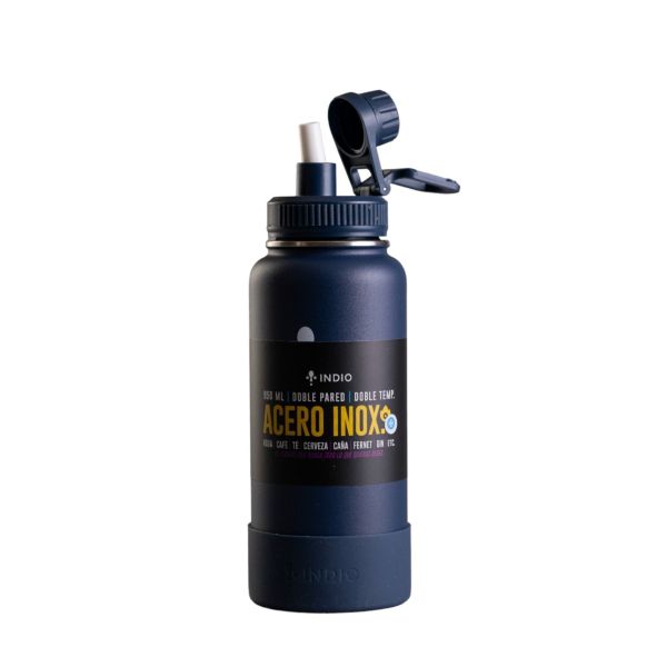 BOTELLA INDIO INOX DOBLE PARED AZUL MARINO 950 ML TAPA ROSCA+PAJITA