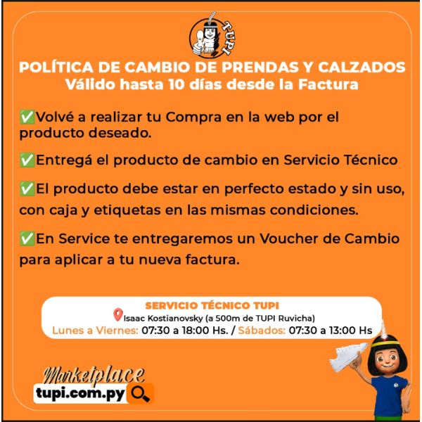 Este producto se puede cambiar o devolver hasta 5 días hábiles posteriores al día de la entrega. Bajo la estricta condición de que el producto se encuentre en perfecto estado, cuente con todos sus componentes, esté limpio, sin uso ni lavado y no cuente con daño ocasionado. Además solo será aceptado si el embalaje o caja se encuentre en su estado original sin desperfectos.