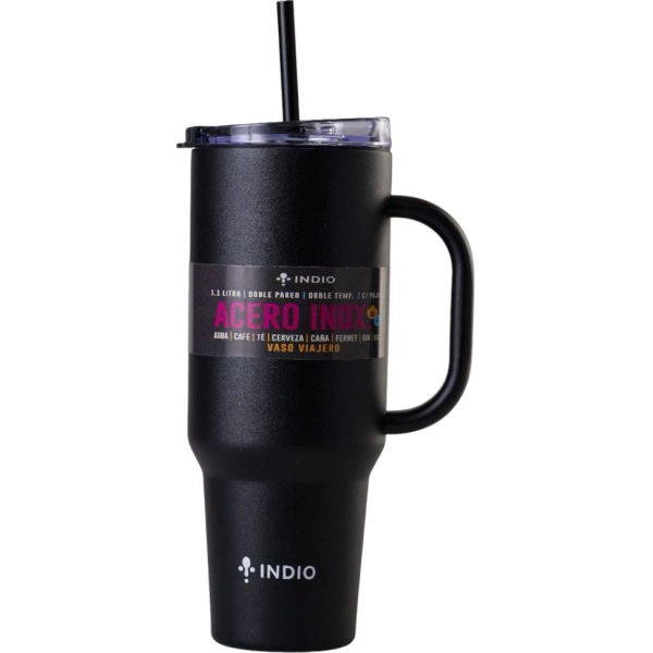 VASO TERMICO INDIO ACERO INOX VIAJERO NEGRO C/ MANIJA Y PAJITA 1,1L