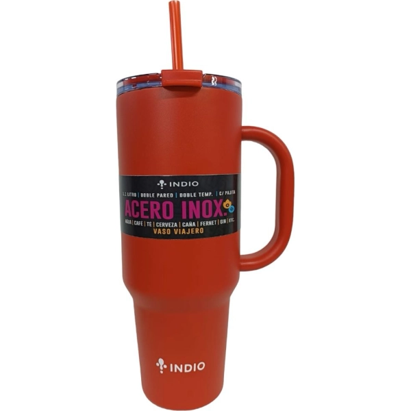 VASO TERMICO INDIO ACERO INOX VIAJERO NARANJA C/ MANIJA Y PAJITA 1,1L