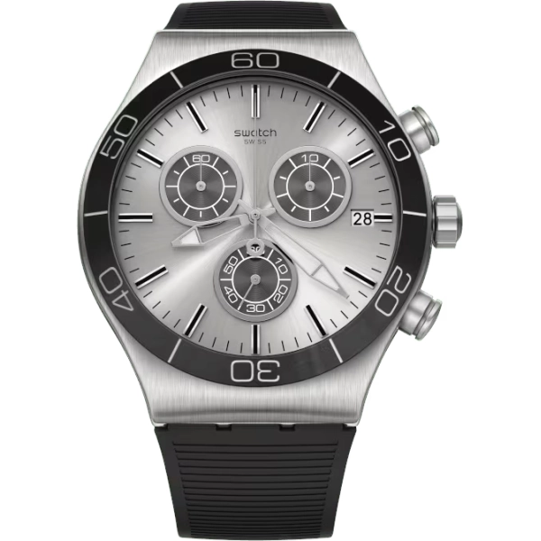Este cronógrafo de acero inoxidable viene con una correa de caucho negro con líneas horizontales y una correa con hebilla de acero inoxidable engastada en una caja del mismo material, pero cepillado. Pero la verdadera estrella de este reloj IRONY CHRONO es la esfera, con un acabado plateado cepillado al sol, unos contadores de aleta creusé en color negro, apliques negros y plateados y el logotipo también impreso en negro. Su toque final es el indicador de fecha que incorpora en la esfera (colocado a la altura de las 3 h), los números e índices plateados del bisel de acero inoxidable negro y el revestimiento de PVD del mismo color.