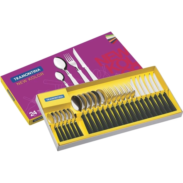 Tu casa merece artículos de calidad que puedan dejar tus comidas más completas y agradables. Con el Juego de Cubiertos Tramontina New Kolor con Láminas de Acero Inoxidable y Mangos de Polipropileno Negro 24 Piezas garantizas toda la calidad y belleza que Tramontina te puede ofrecer. El juego tiene tenedores, cucharas y cuchillos con láminas de acero inoxidable y mangos de polipropileno que propician mejor manejo, ya que el formato anatómico de los mangos permite un encaje perfecto en la mano. Los cuchillos tienen láminas templadas, lo que le ofrece resistencia y durabilidad a su filo de corte. Y para que tengas todavía más facilidad, las piezas se pueden llevar al lavavajillas. Así, tu día a día queda todavía mejor.