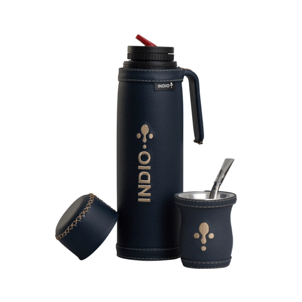 - Termo INDIO de 1 litro de acero inoxidable de doble pared aislado al vacio forrado en Simil Cuero.