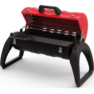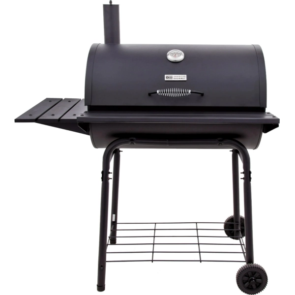 La parrilla de carbón 840 es una parrilla de tamaño completo estilo barril con 840 pulgadas cuadradas de espacio para cocinar hasta 20 hamburguesas. Obtenga una cocción a fuego alto en las rejillas de hierro fundido de alta resistencia, mientras que los múltiples reguladores y una rejilla de acero ajustable en altura le brindan control del calor y el humo. Puede monitorear el calor en el indicador de temperatura, montado directamente en la tapa. Un estante frontal de longitud completa, ganchos para herramientas y estantes laterales plegables brindan un amplio espacio para ingredientes, herramientas y accesorios.rnrnrnrnLa parrilla de carbón 840 también se puede convertir en un ahumador offset utilizando la parrilla de carbón de mesa American Gourmet® (se vende por separado) como caja de fuego.