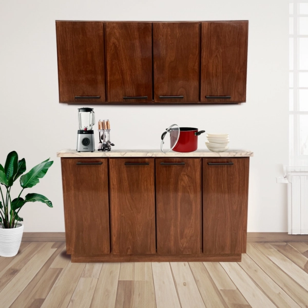 Equipa tu cocina con este MUEBLE DE COCINA CON ALACENA 4 CUERPOS CBC. Este kit de cocina ya incluye un módulo más alacena de 4 puertas. Material de madera enchapada, fabricación nacional con garantía de fábrica de 1 año. Lustre en color Nogal y tiradores en negro, mesada color Granito.