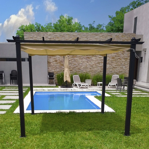 Toldo tipo pérgola, con techo corredizo. Ideal para jardines,hoteles y restaurantes.