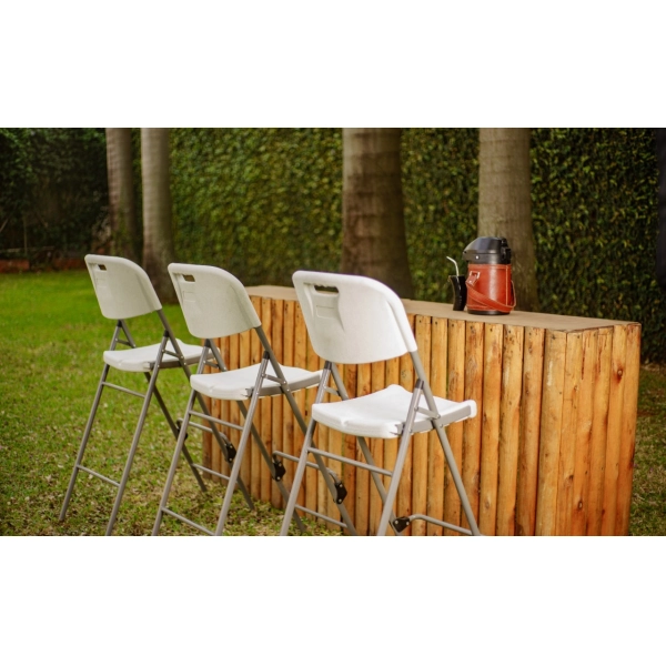 Sillas plegables altas de color blanco, especial para bares al aire libre, desayunador o jardines. De material resistente y de alto confort con reposapies.