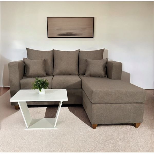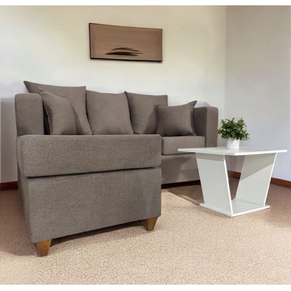 SOFA UNANIME TOBATI 2L + CHAISE MOVIBLE MARRON PINO + 2 ALMOHADAS + MESITA