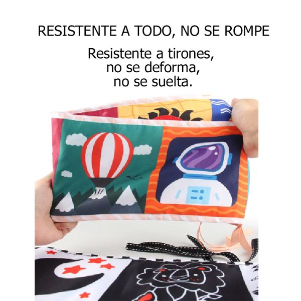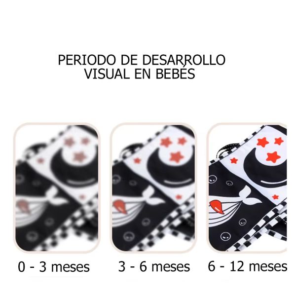 - Estímulo visual por etapas: Integra distintas ilustraciones y patrones pensados para cada fase de desarrollo visual (0–3, 3–6 y 6–12 meses). De esta manera, el bebé encuentra siempre imágenes adecuadas a su nivel de percepción.