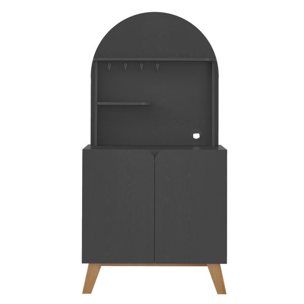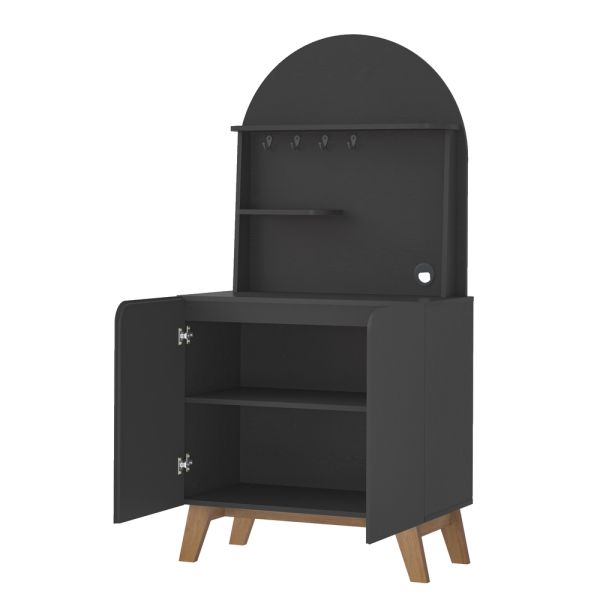 4 soportes metálicos para tazas, organizadas de forma práctica y segura. 2 puertas con bisagras metálicas, que ocultan un espacioso compartimento interno. Repisas abiertas, perfectas para utensilios, adornos o frascos decorativos. Espacio ideal para cafetera u otros electrodomésticos pequeños. Panel curvo y detalles redondeados, que aportan calidez y elegancia al ambiente. 1 repisa interna, para mayor capacidad de almacenaje. Ya sea en la cocina, comedor o sala, el Rincón del Café Vienanegro convierte cada pausa en un ritual placentero.