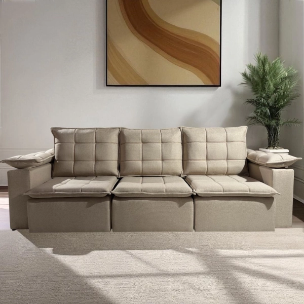 Elegancia, confort y versatilidad en un solo mueble. Tapizado de alta calidad con costuras acolchonadas. Asientos retráctiles. Perfecto para salas de estar, optimizando el espacio con su mecanismo ajustable.