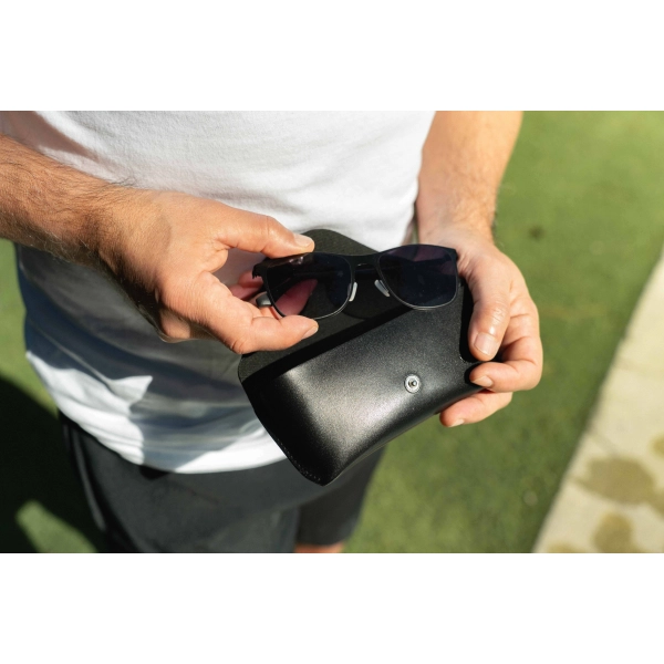 Lentes con armazón negro mate, cristales degrade negro smoke polarizados. Estuche de eco cuero