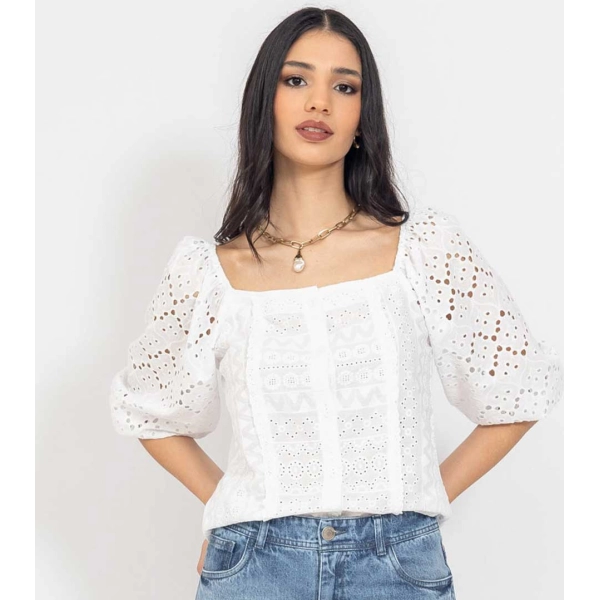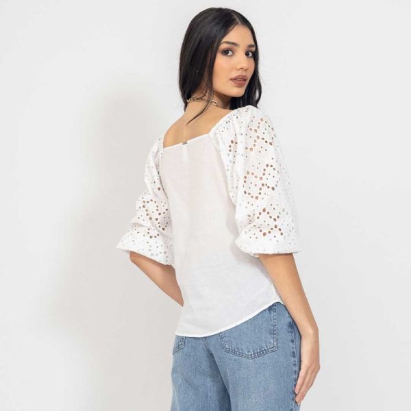Blusa blanca de manga 3/4, con delicado detalle de broderie para un look femenino y elegante.
