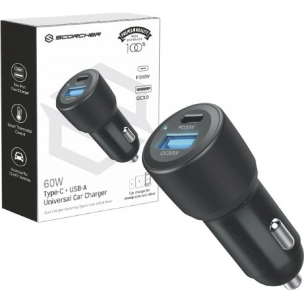 Cargador Automotriz SCORCHER USB Tipo-C + USB-A, Diseñado para los que exigen potencia y velocidad en todo momento. Con 60W de salida total, ofrece carga rápida y estable para celulares, tablets, GPS y más. Su diseño universal y compacto encaja perfectamente en cualquier vehículo, brindando energía inmediata y segura en tus viajes. Conecta, carga y sigue tu camino sin interrupciones con SCORCHER.