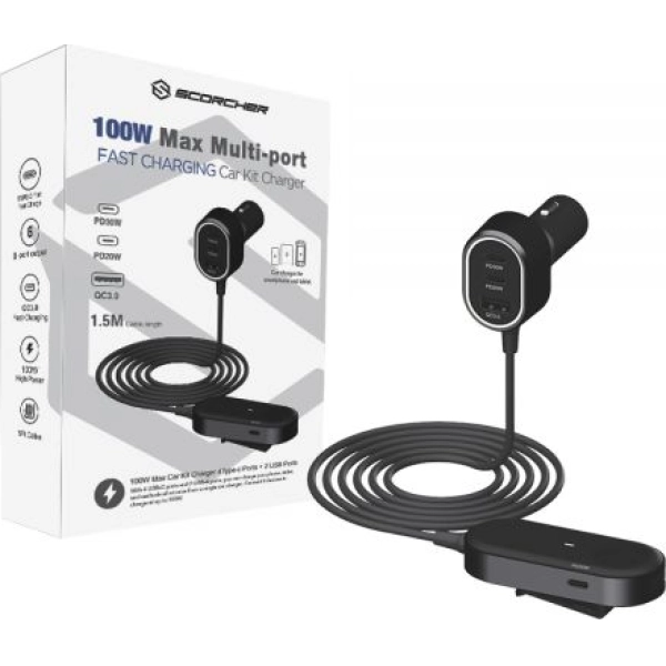 Cargador de Múltiples Puertos SCORCHER, la máxima potencia y versatilidad en un solo dispositivo. Con 100W de potencia total, este cargador universal mantiene todos tus equipos listos: smartphones, tablets, notebooks y más. Incluye 4 puertos USB Tipo-C y 2 puertos USB, permitiendo cargar hasta 6 dispositivos al mismo tiempo con velocidad y seguridad. Su cable de 1.5 metros te brinda comodidad y alcance, ideal para el hogar, la oficina o tus viajes. Energía ilimitada con el rendimiento SCORCHER.
