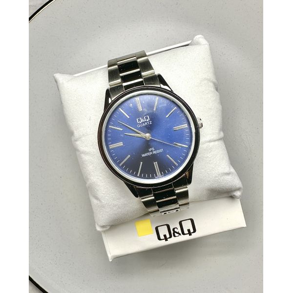 Reloj de la marca Q&Q acero inoxidable plateado cara redonda fondo azul. Elegante con manecillas largas. A pila, mide 28 cm de largo y 4 de diámetro.