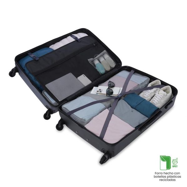Para tus viajes más largos, la maleta de viaje 23 kilos 360 Bazy L es la compañera ideal. Su diseño en material rígido (ABS & Policarbonato) ofrece una resistencia excepcional y un acabado con textura única. Las ruedas 360 facilitan el manejo en cualquier dirección, mientras que el sistema TSA proporciona seguridad en aeropuertos. Con un separador interno y organizador, podrás empacar todo lo necesario.