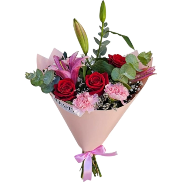 Delicada mezcla de lirios, 3 rosas y 2 claveles, ideal para un gesto romántico. El envoltorio puede variar.