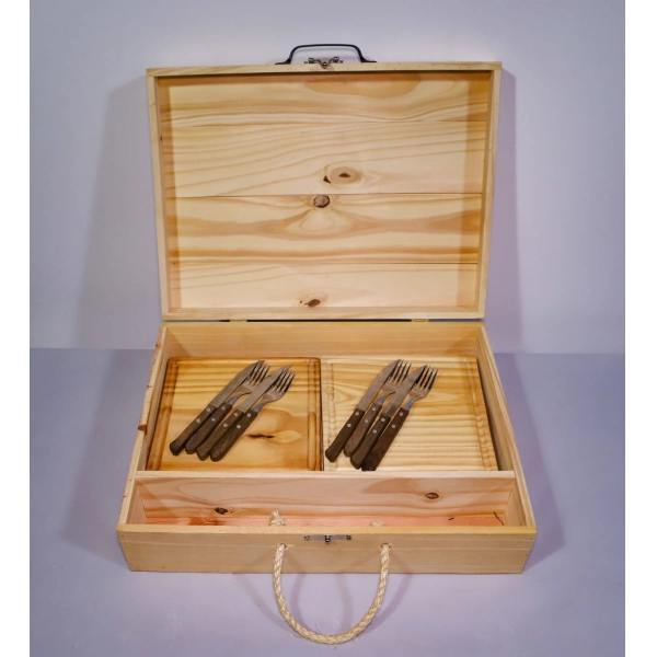 Maletín de madera con herrajes metálicos, cuatro platos de pino y cuatro pares de cubiertos de acero inoxidable. Diseño artesanal resistente y funcional para reuniones familiares o entre amigos.